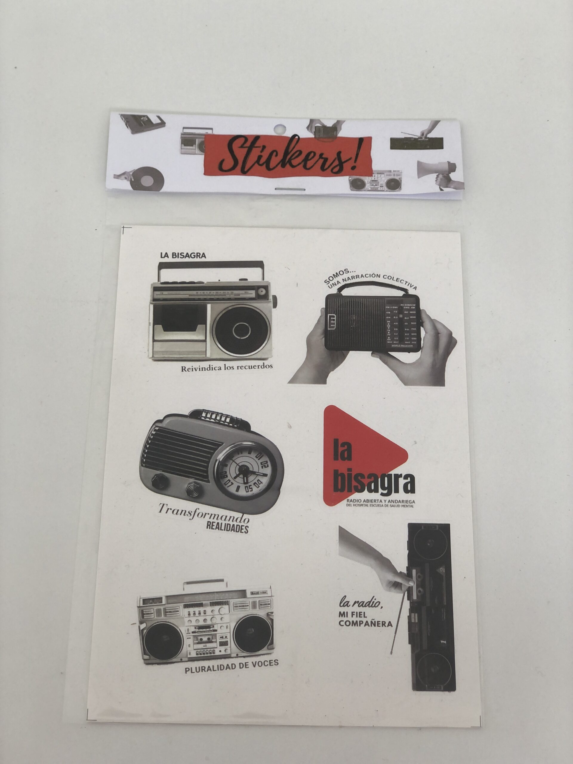 Plancha de 12 calcomanías diseñados y elaborados por La Bisagra Radio (Paraná)