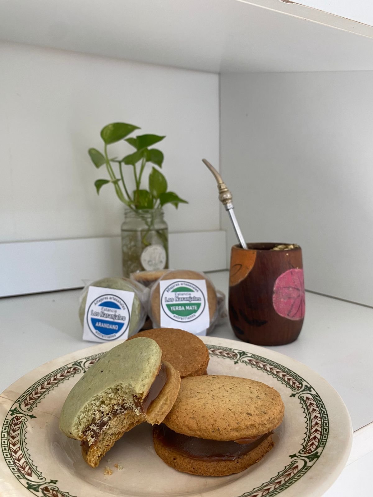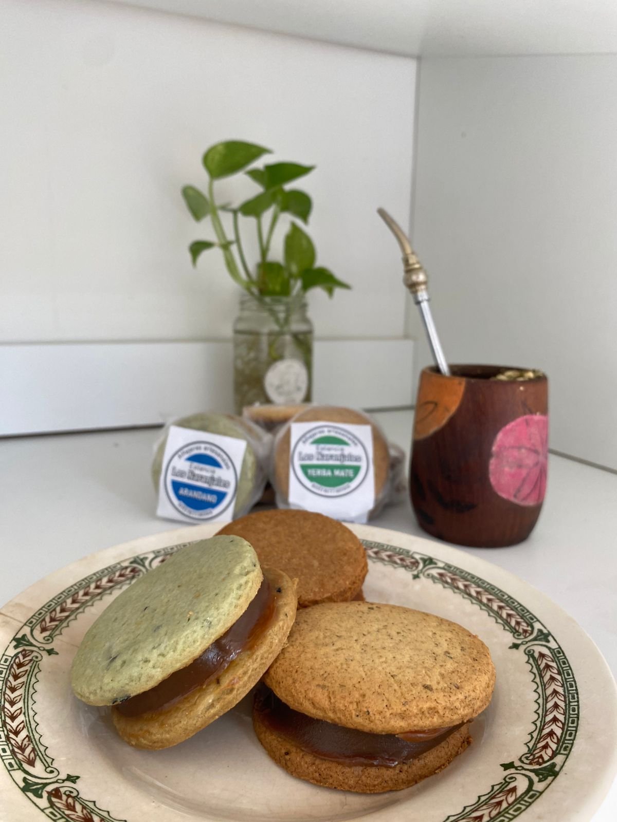 Alfajores artesanales de yerba mate, integrales,miel,arándanos con relleno de dulce de leche